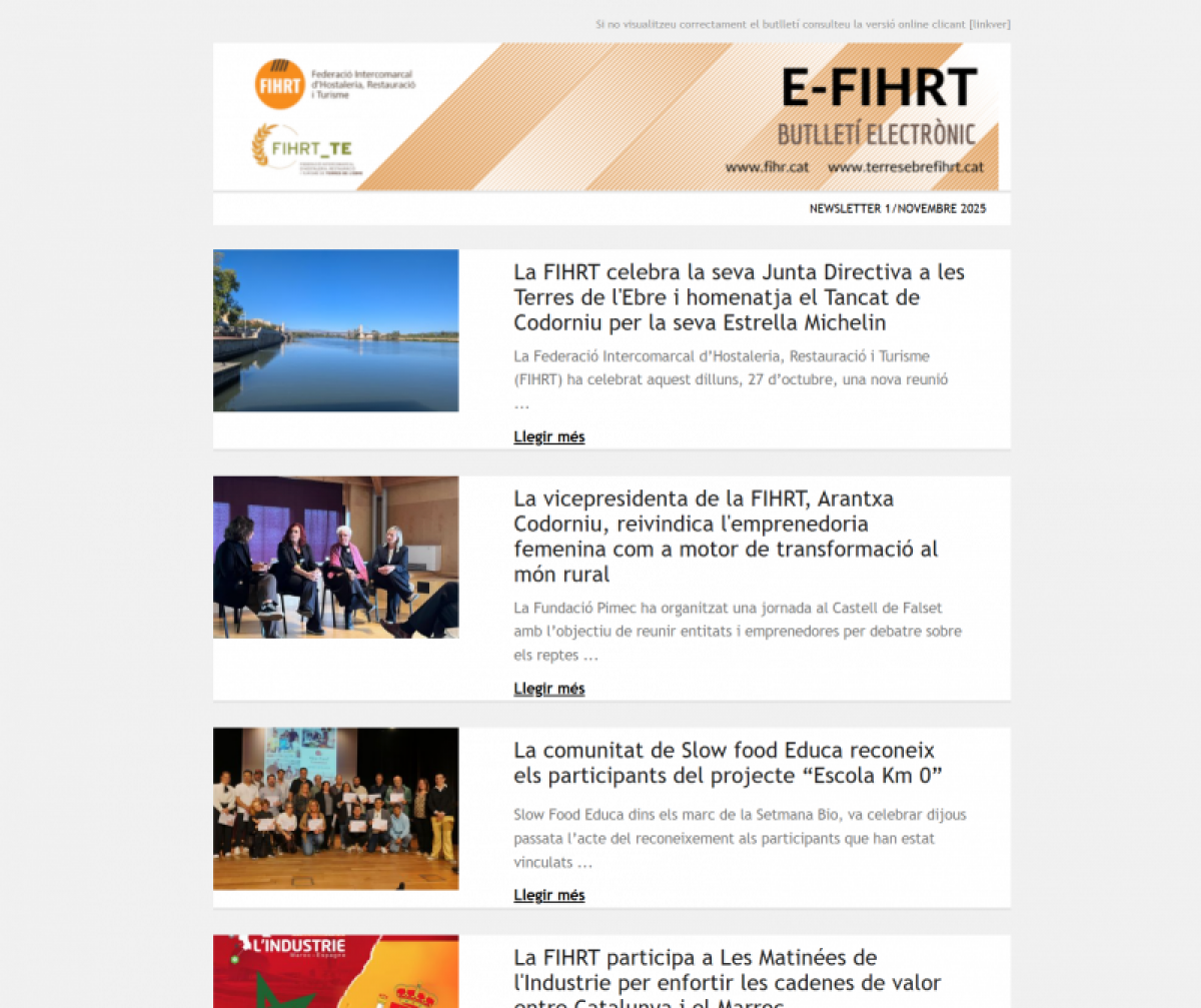 Aquest nou número de l’E-FIHRT recull l’activitat recent de la Federació Intercomarcal d’Hostaleria, Restauració i Turisme i dels gremis associats arreu del territori.