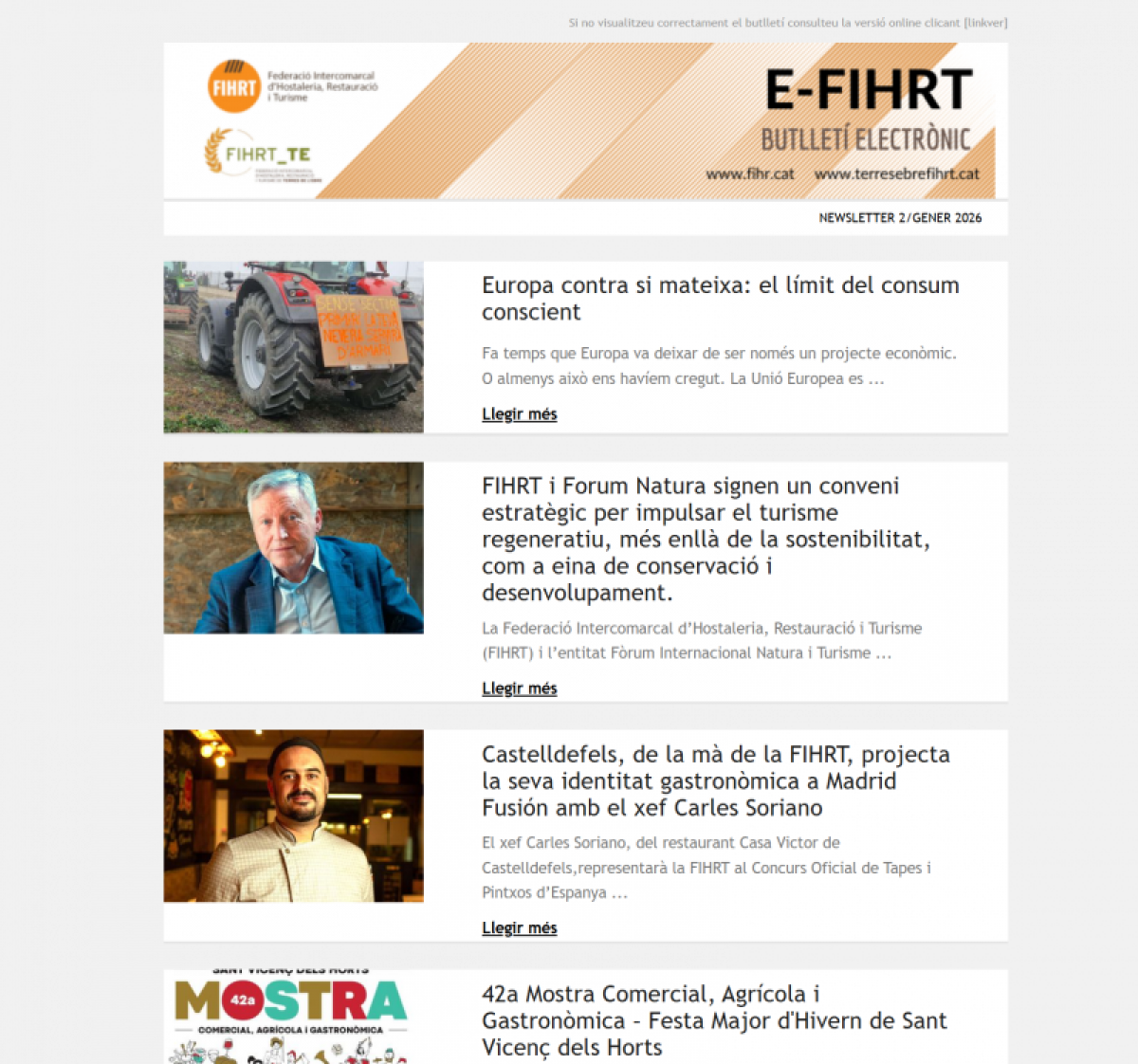 El newsletter posa també en valor la gastronomia com a eina de projecció territorial i identitària, amb la presència de la FIHRT a Madrid Fusión de la mà del xef Carles Soriano, així com amb un ampli calendari de mostres, jornades gastronòmiques i festes populars arreu del territori. Aquest conjunt d’iniciatives evidencia el paper de la restauració com a motor econòmic, cultural i turístic de proximitat.