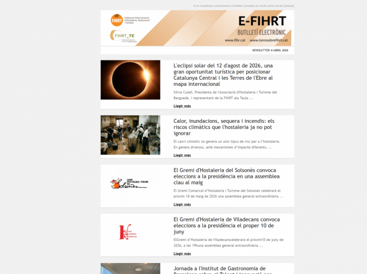 Aquesta setmana, el nou E-FIHRT 4/abril 2026 arriba carregat de continguts estratègics per al sector turístic, hoteler i de restauració, demostrant un cop més la capacitat de la FIHRT de connectar actualitat, territori i oportunitats per als seus gremis i associats.