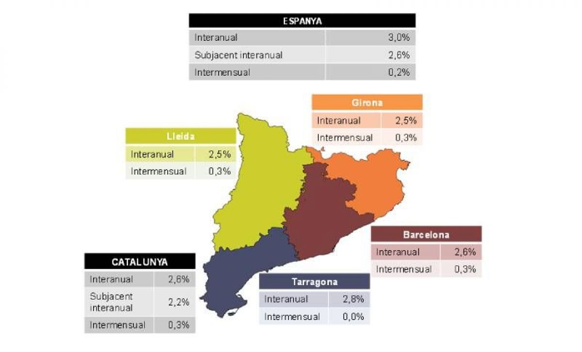 En termes de variació interanual, l’increment a Catalunya continua per sota del d’Espanya (2,6% i 3,0%, respectivament). La inflació subjacent se situa a Catalunya quatre dècimes per sota la que registra Espanya (2,2% i 2,6%, respectivament).