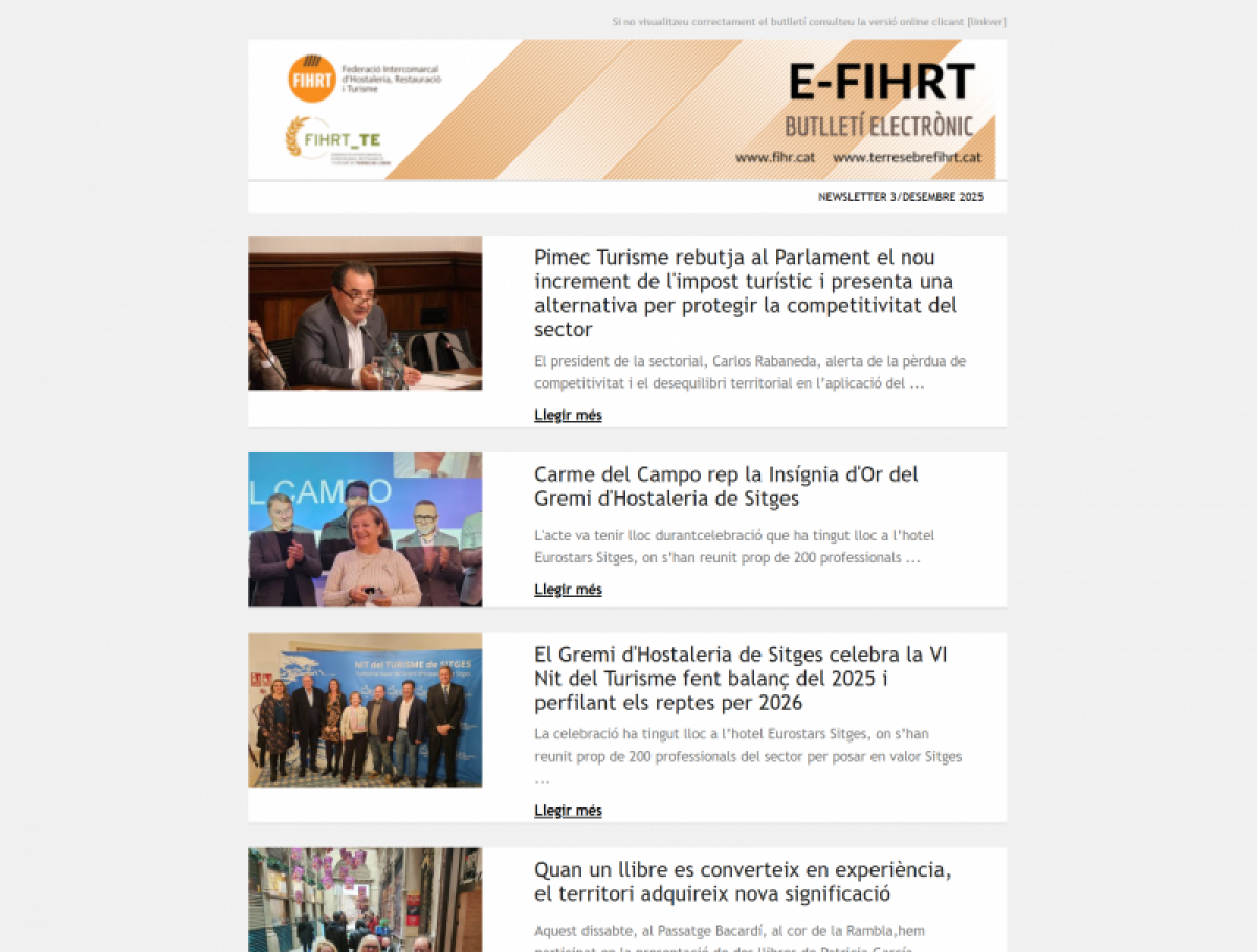 El darrer butlletí E-FIHRT, concentra un volum significatiu d’informació que reflecteix l’estat de situació del sector turístic i d’hostaleria a Catalunya en un moment de tensió financera per al món local i d’intensos debats sobre la competitivitat del sector. Tot i que el títol del butlletí planteja un interrogant de gran transcendència –la dependència dels ajuntaments de l’Impost sobre Estades en Establiments Turístics (IEET) i la funció de la taxa turística com a possible salvavides municipal–, l’edició desplega una panoràmica molt més àmplia sobre la realitat territorial, econòmica i institucional.