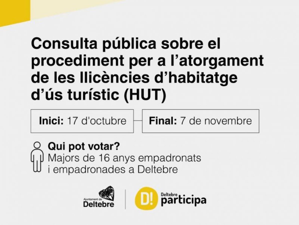 El consistori de Deltebre ha iniciat una nova fase de participació ciutadana mitjançant la consulta pública sobre l’ordenança reguladora del procediment i dels criteris de qualitat per a l’atorgament de les llicències d’habitatge d’ús turístic (HUT). Aquesta iniciativa —que romandrà oberta des del 17 d’octubre fins al 7 de novembre de 2025— pretén establir un marc normatiu que permeti compatibilitzar l’activitat turística amb la preservació del teixit residencial, la rehabilitació urbana i la convivència veïnal.