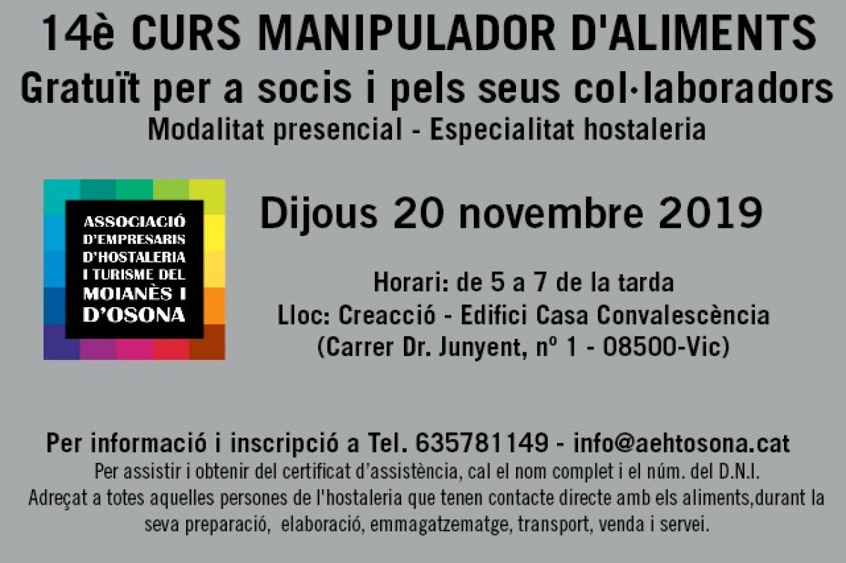 L'Associació ha programat per al proper 20 de novembre un nou Curs de Manipulador d'Aliments, de dues hores de durada, de 17h a 19h, gratuït per als socis i els seus col.laboradors.