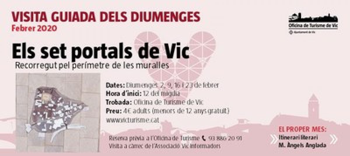 La visita guiada ‘Els set portals de Vic’, sortirà tots els diumenges de febrer (2, 9, 16 i 23) a les 12 del migdia des de l’Oficina de Turisme de la ciutat. El preu de la visita guiada és de 4 euros per adults i majors de 12 anys, mentre que pels nens menors de 12 anys és gratuït.