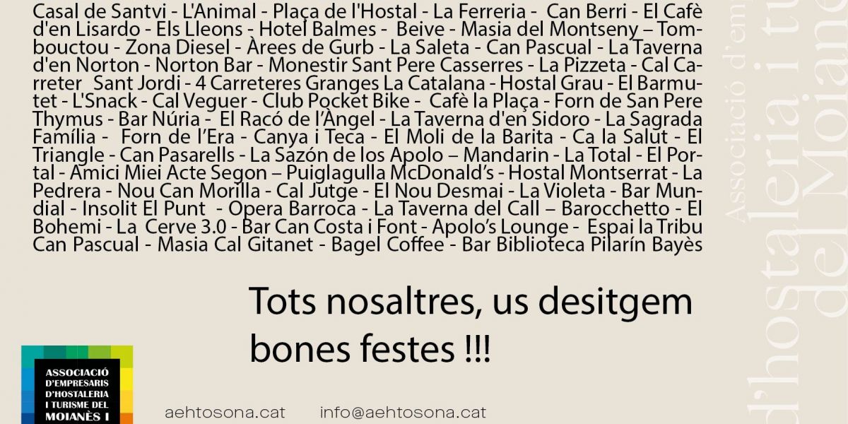 Des de l'Associació us desitgem un Bon Nadal i unes Bones Festes, agraint-vos la confiança que cada dia, com a emprearis i empresàries ens doneu, per continuar endavant amb l'Entitat