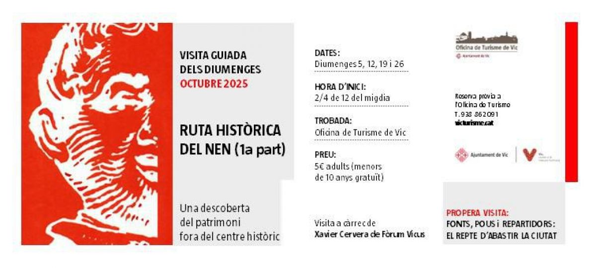 Les visites guiades dels diumenges, organitzades per l’Ajuntament de Vic, tornen aquest mes d’octubre amb una proposta dedicada a la Ruta històrica del Nen (1a part), conduïda per Xavier Cervera, de Fòrum Vicus. La iniciativa permet descobrir el patrimoni històric i cultural de diferents barris i zones de la ciutat vinculades a la figura del Nen: El Barri d’Osona, la Calla, l’Estadi, l’Horta Vermella, Santa Anna i la Serra-de-senferm.