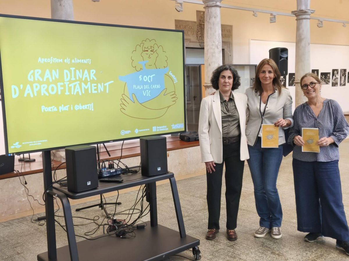Aquest diumenge 5 d’octubre, la plaça del Carbó de Vic acollirà el Gran Dinar d’Aprofitament, un àpat gratuït elaborat amb aliments recuperats per conscienciar la ciutadania sobre el malbaratament alimentari i promoure la sostenibilitat. La iniciativa la van presentar aquest dimecres Raquel Sánchez, directora dels serveis territorials del Departament d’Agricultura, Ramaderia, Pesca i Alimentació a la Catalunya Central; la regidora de Comerç, Estratègia Econòmica i Desenvolupament Territorial de l’Ajuntament de Vic, Bet Piella, i la directora de la Plataforma Aprofitem els Aliments, Gaby Susanna, al Centre Cultural Joan Triadú.