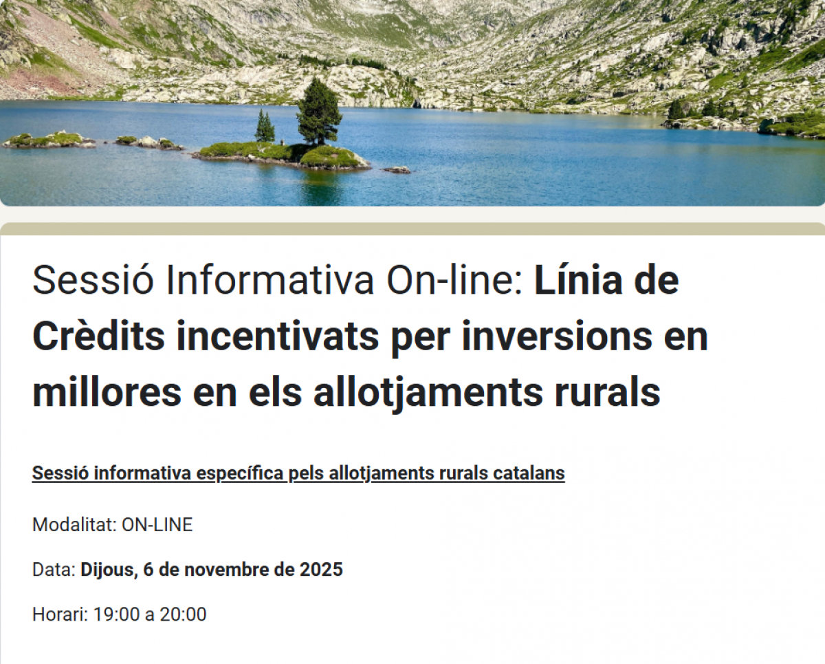 Per donar resposta als allotjaments rurals interessats en conèixer més detalls sobre aquesta línia de crèdit, Osona Turisme us proposa assistir a aquesta sessió informativa en línia per aclarir dubtes i ampliar la informació.