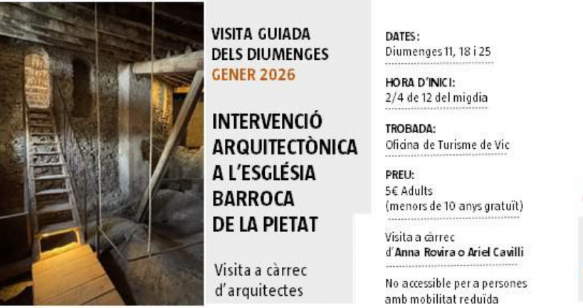 Les visites guiades dels diumenges, organitzades per l’Ajuntament de Vic, enceten el 2026 amb una proposta dedicada a la intervenció arquitectònica realitzada a l’església barroca de la Pietat. L’activitat anirà a càrrec dels arquitectes Ariel Cavilli i Anna Rovira, alternativament, i, en aquesta ocasió, cal tenir en compte que la ruta no és accessible per a persones amb mobilitat reduïda.
