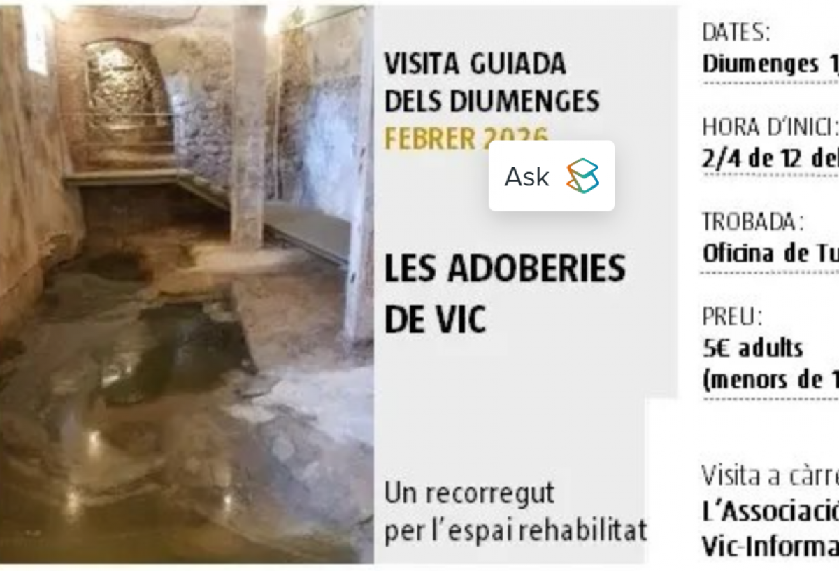 Les visites guiades dels diumenges, organitzades per l’Oficina de Turisme de l’Ajuntament de Vic, seguiran aquest mes de febrer amb un recorregut per l’espai rehabilitat de les Adoberies de Vic, una de les joies del patrimoni industrial de la ciutat. Les visites permetran conèixer el procés de rehabilitació d’aquest espai i descobrir quin paper van tenir les adoberies en l’activitat econòmica i productiva de Vic, així com la seva evolució fins a l’actualitat. L’activitat d’aquest mes anirà a càrrec de l’Associació de Vic-Informadors.